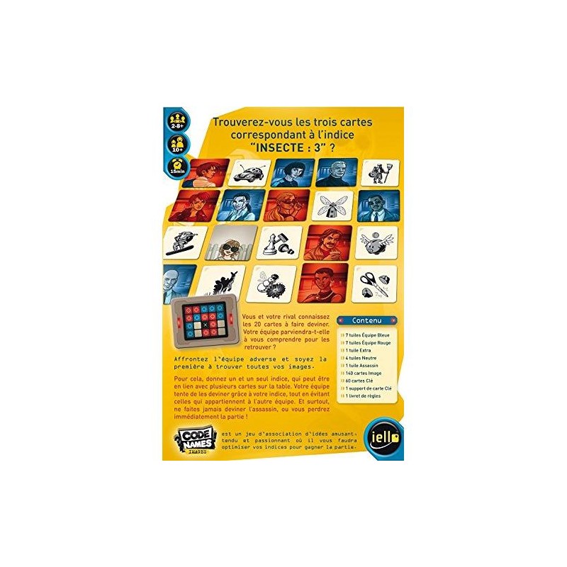 Vous et votre rival connaissez les 20 cartes à faire deviner. Votre équipe parviendra-t-elle à vous comprendre pour les retrouver ? Donnez un et un seul indice, qui peut être en lien avec plusieurs cartes sur la table. Votre équipe tente de les deviner grâce à votre indice, tout en évitant celles qui appartiennent à l’autre équipe. Et surtout, ne faites jamais deviner l’assassin, ou vous perdrez immédiatement la partie