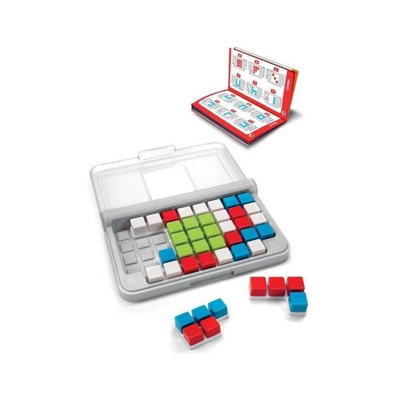 1 plateau de jeu compact avec couvercle transparent, 10 pièces de puzzle colorées, 1 livret avec 120 défis et solutions.