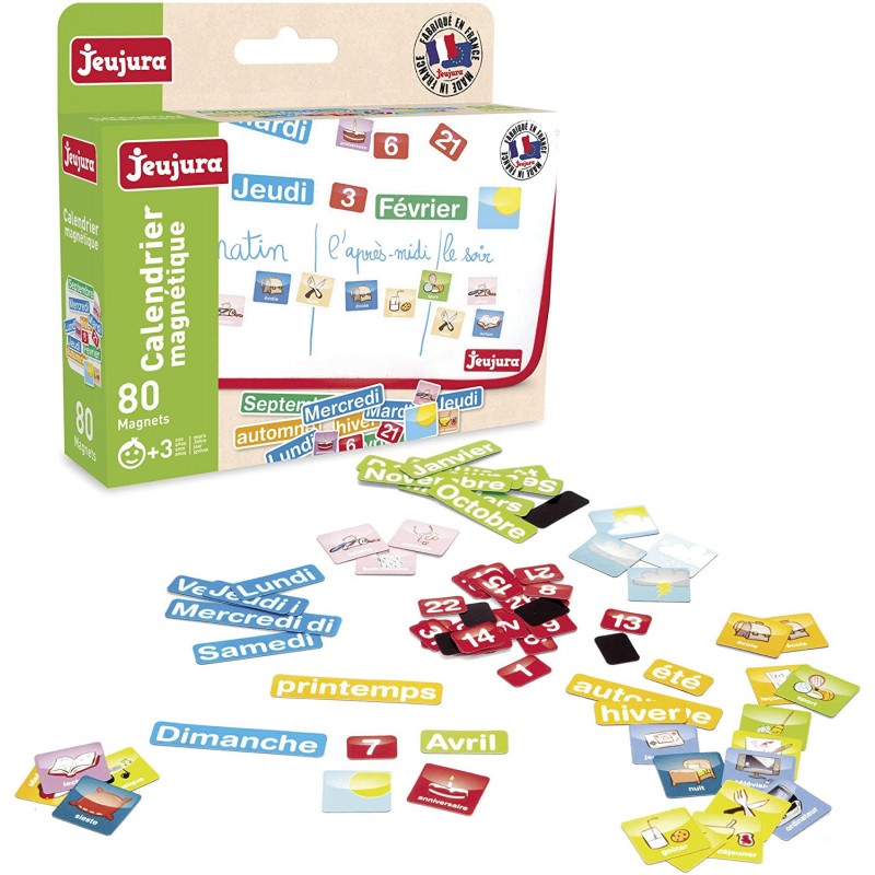 Voici les Magnets Calendrier de chez Jeujura. 80 magnets comprenant les jours, les mois et les saisons et des repères visuels des événements de la journée comme les repas, un anniversaire à utiliser sur les tableaux magnétiques ou le frigo ! Un support idéal pour apprendre aux enfants à se repérer dans le temps. Fabriqué en France. A partir de 3 ans !