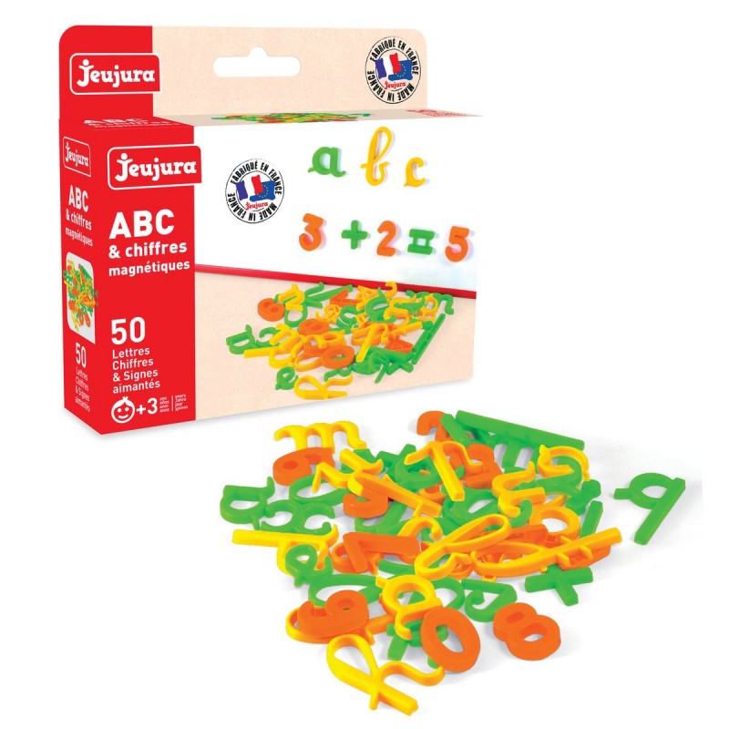 Voici un coffret de 50 lettres cursives, chiffres et signes magnétiques de Jeujura contenant toutes les lettres de l'alphabet, des chiffres et des signes aimantés.