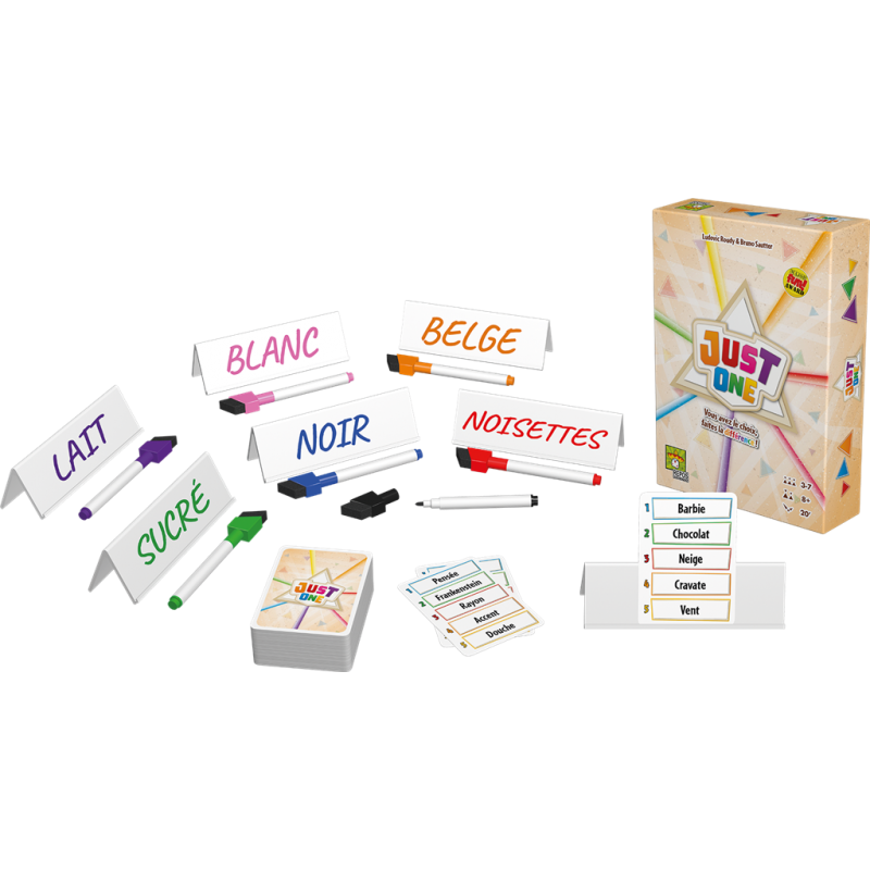 Si deux mots sont identiques, on les efface ! Celui qui devine aura donc moins d’indices pour trouver le mot mystère. Gardez bien à l’esprit que le jeu est coopératif et qu’il faut essayer de trouver un maximum de cartes du paquet ensemble pour gagner ! Contenu 110 cartes, 7 chevalets, 7 feutres effaçables, 1 livret de règles.