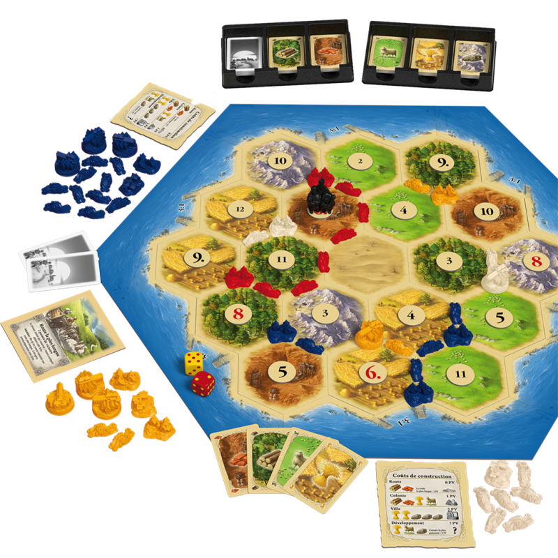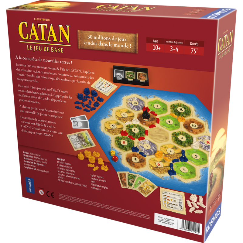 Catan, c'est plusieurs millions d'exemplaires vendus à travers le monde et le porte-étendard d'une nouvelle manière de jouer. C'est le jeu qui à fait découvrir au monde tout ce qui fait le sel des jeux à l'allemande : une mécanique fluide et bien pensée, des règles simples, des parties courtes pour un jeu de stratégie et la non-élimination des joueurs en cours de partie. Construisez votre route vers la victoire !